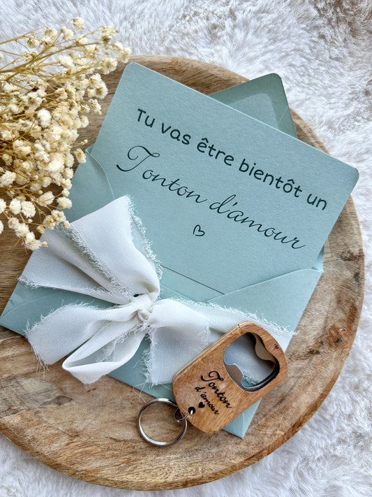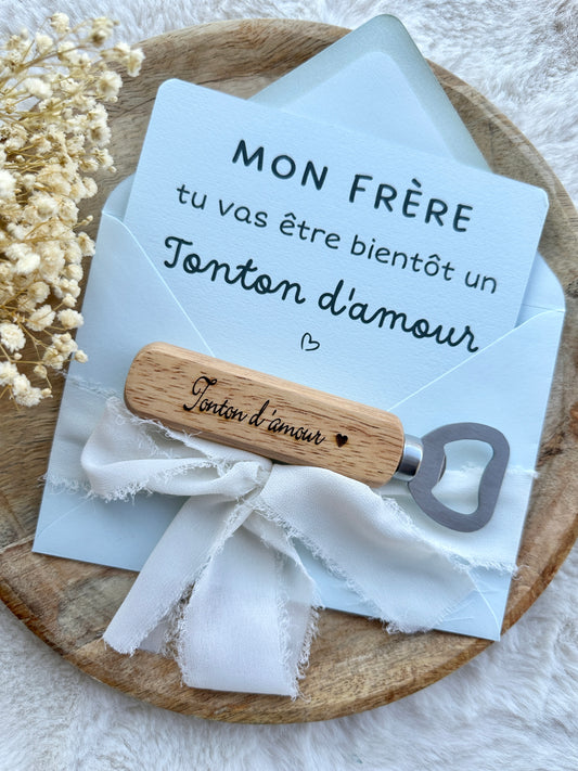 Annonce de grossesse décapsuleur/bouchon bouteille et carte pour tonton d'amour beige