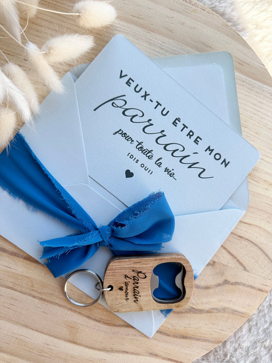 Annonce de grossesse décapsuleur j'aimerai que tu sois et carte pour parrain d'amour beige