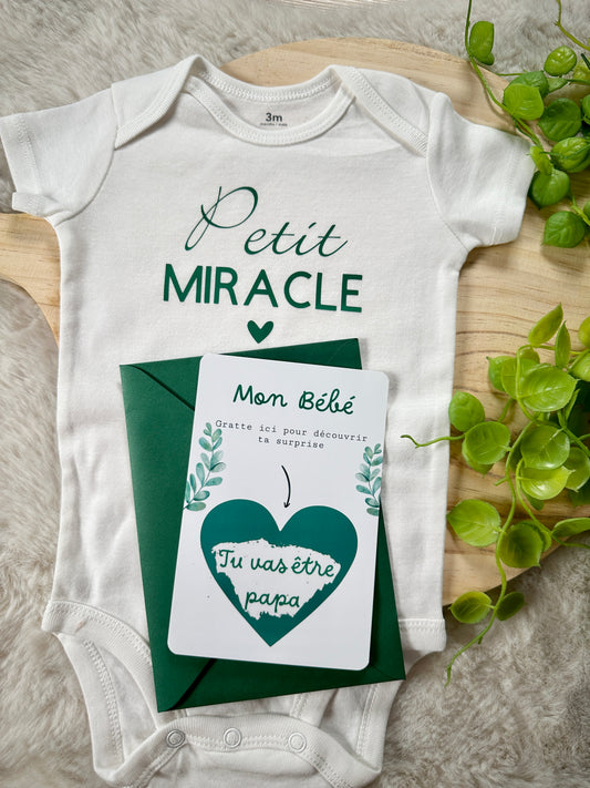Carte annonce de grossesse petit miracle futur papa avec body et carte a gratter