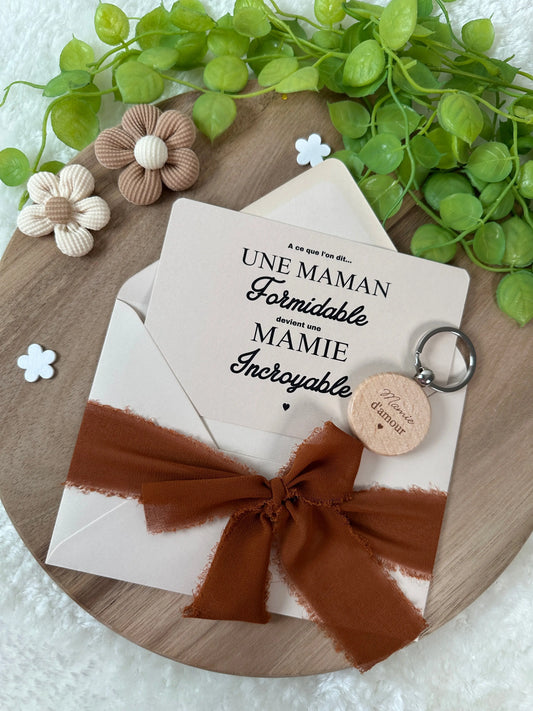 Annonce grossesse mamie carte avec petit porte clé en bois pour mamie d’amour
