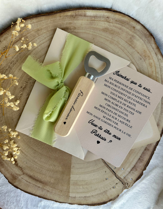 Annonce de grossesse décapsuleur j'aimerai que tu sois et carte pour parrain d'amour beige