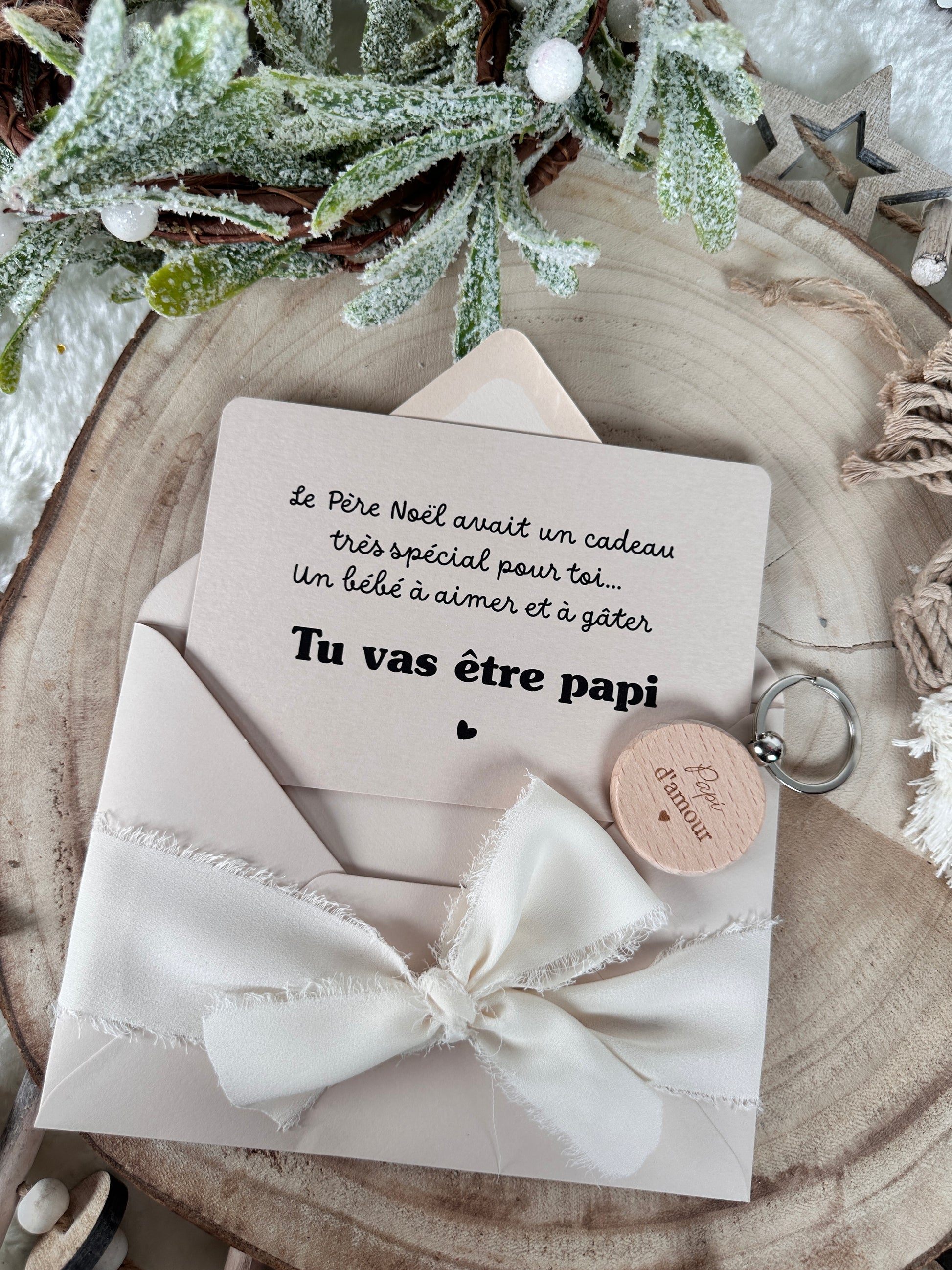 Faites de votre annonce de grossesse un moment inoubliable avec nos cartes spécialement conçues pour surprendre vos proches ! Chaque carte est accompagnée d’un porte clés en bois.
