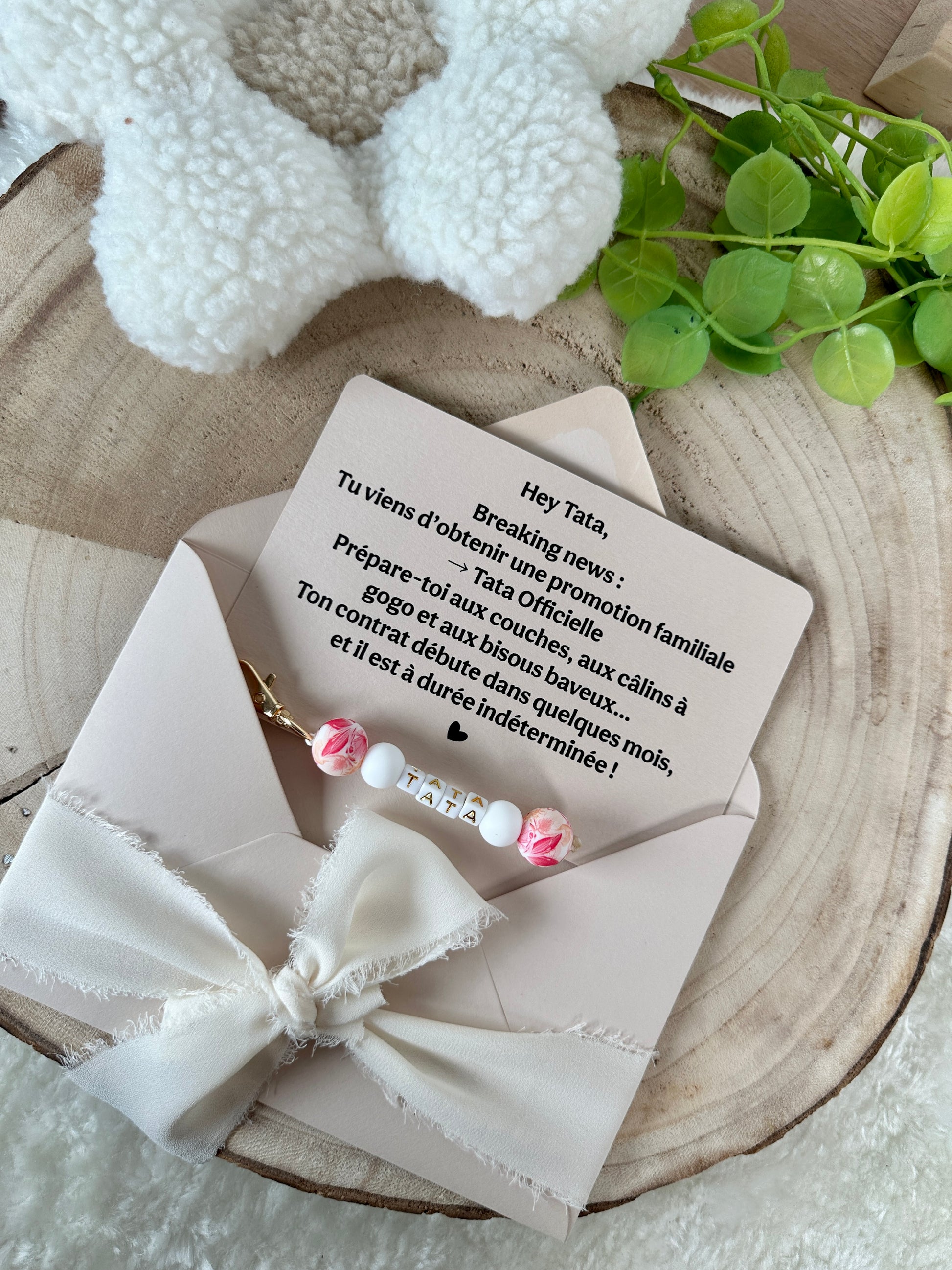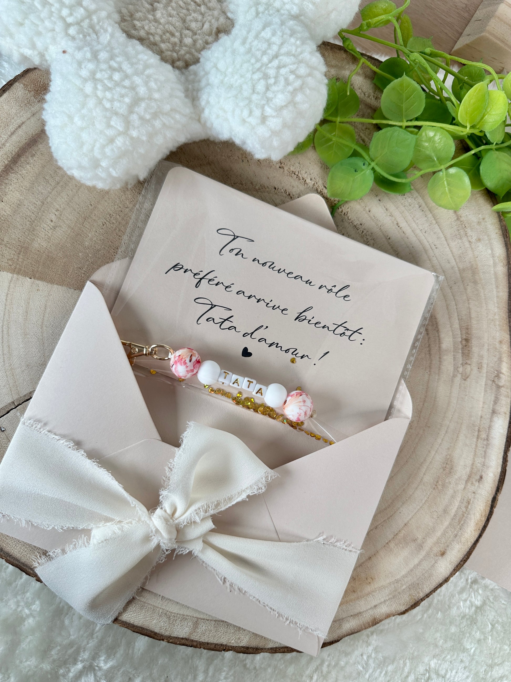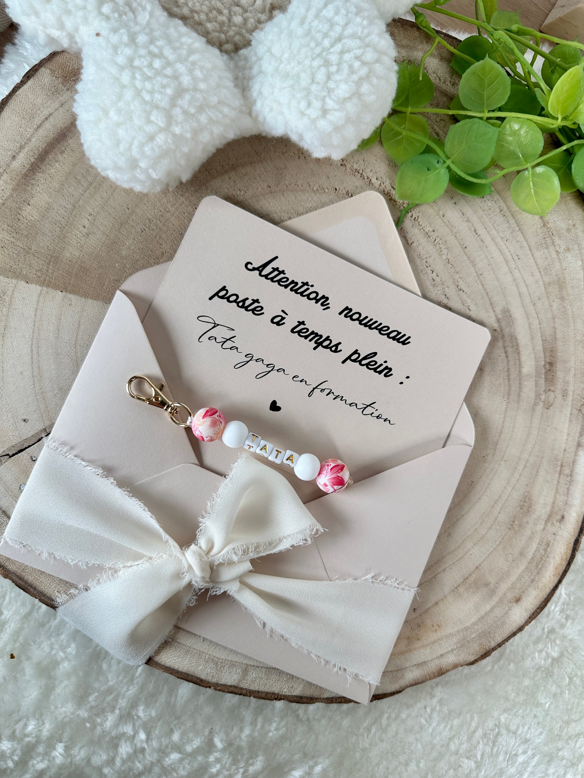 Annonce grossesse carte porte clé perle tata rouge orange