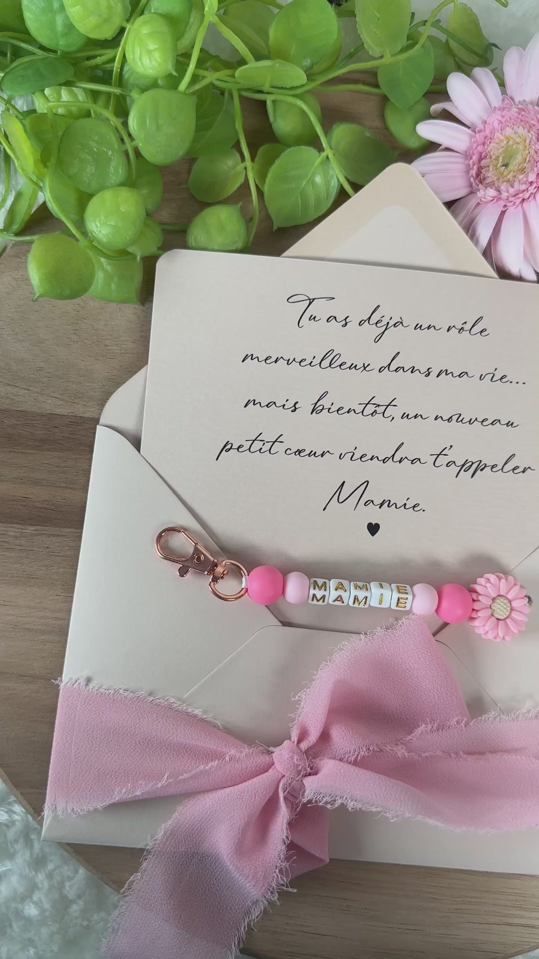 Annonce grossesse mamie carte avec petit porte clé en perles